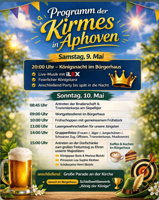 Freut euch auf ein tolles Kirmeswochenende mit Party, Tradition und einem abwechslungsreichen Programm für die ganze Familie!